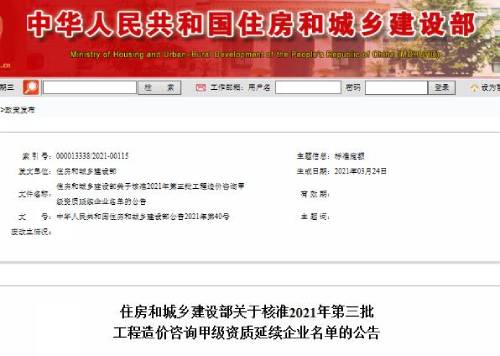 2021年第三批工程造价咨询甲级资质延续企业名单的公告