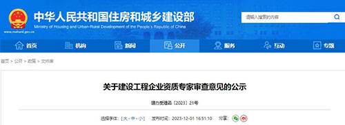 按照《行政许可法》及有关建设工程企业资质管理规定,我部对近期申请建设工程企业资质的申报材料组织了专家审查,现将专家审查意见在住房城乡建设部门户网站(https://www.mohurd.gov.cn)予以公示,以广泛接受社会监督。企业申报材料中的人员、代表工程业绩等详细情况,可通过点击“住房城乡建设部门户网站→建设工程企业资质行政审批专栏→资质申报基本信息公示”进行查询。