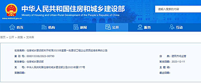 近日,住建部公布关于核准2023年第一批建设工程企业资质延续名单的公告,本批次共有1792家建企通过。