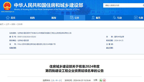 近日,住建部发布关于核准2024年度第四批建设工程企业资质延续名单的公告。