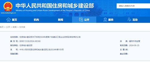 近日,住房城乡建设部发布《关于核准2024年度第六批建设工程企业资质延续名单的公告》。