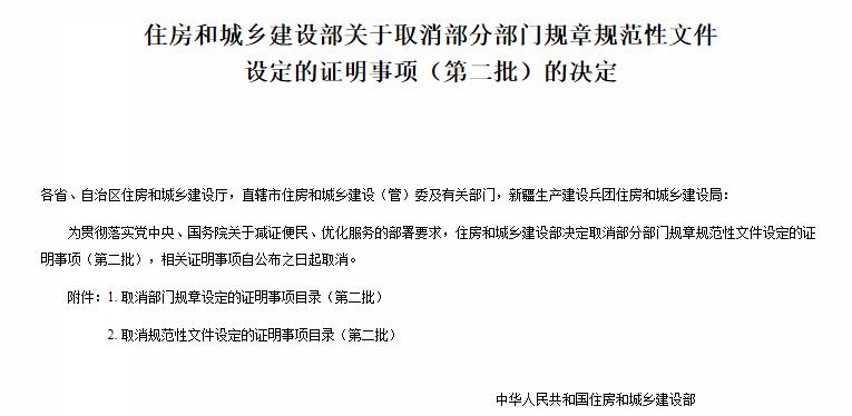 为贯彻落实党中央、国务院关于减证便民、优化服务的部署要求,住房和城乡建设部决定取消部分部门规章规范性文件设定的证明事项(第二批),相关证明事项自公布之日起取消。