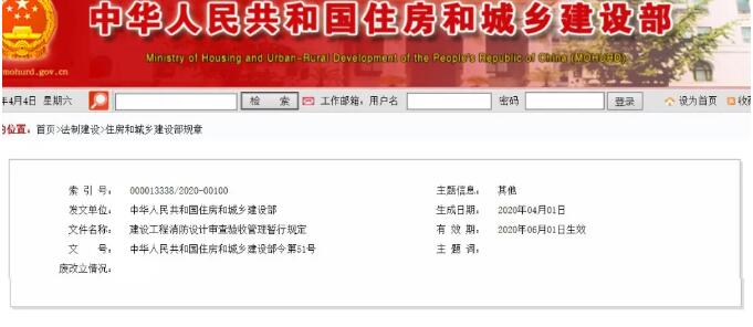 据国家住建部发布的通知,2020年1月19日第15吃部务会议审议通过了《建设工程消防设计审查验收管理暂行规定》,现予以公布,该规定自2020年6月1日起施行。